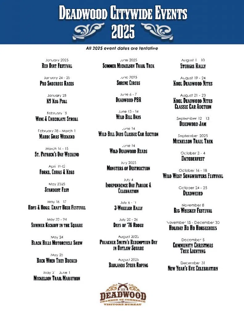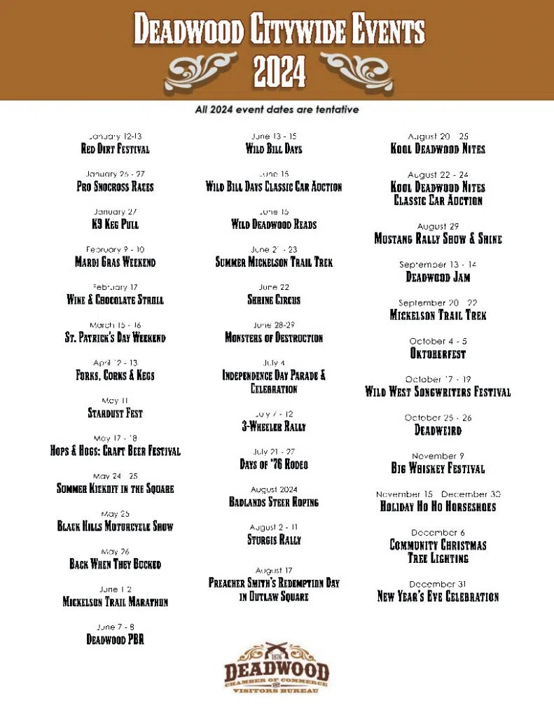 We are nearly halfway through 2024, but there are still plenty of opportunities for fun in Deadwood: And mark your calendars in 2025 for even more: