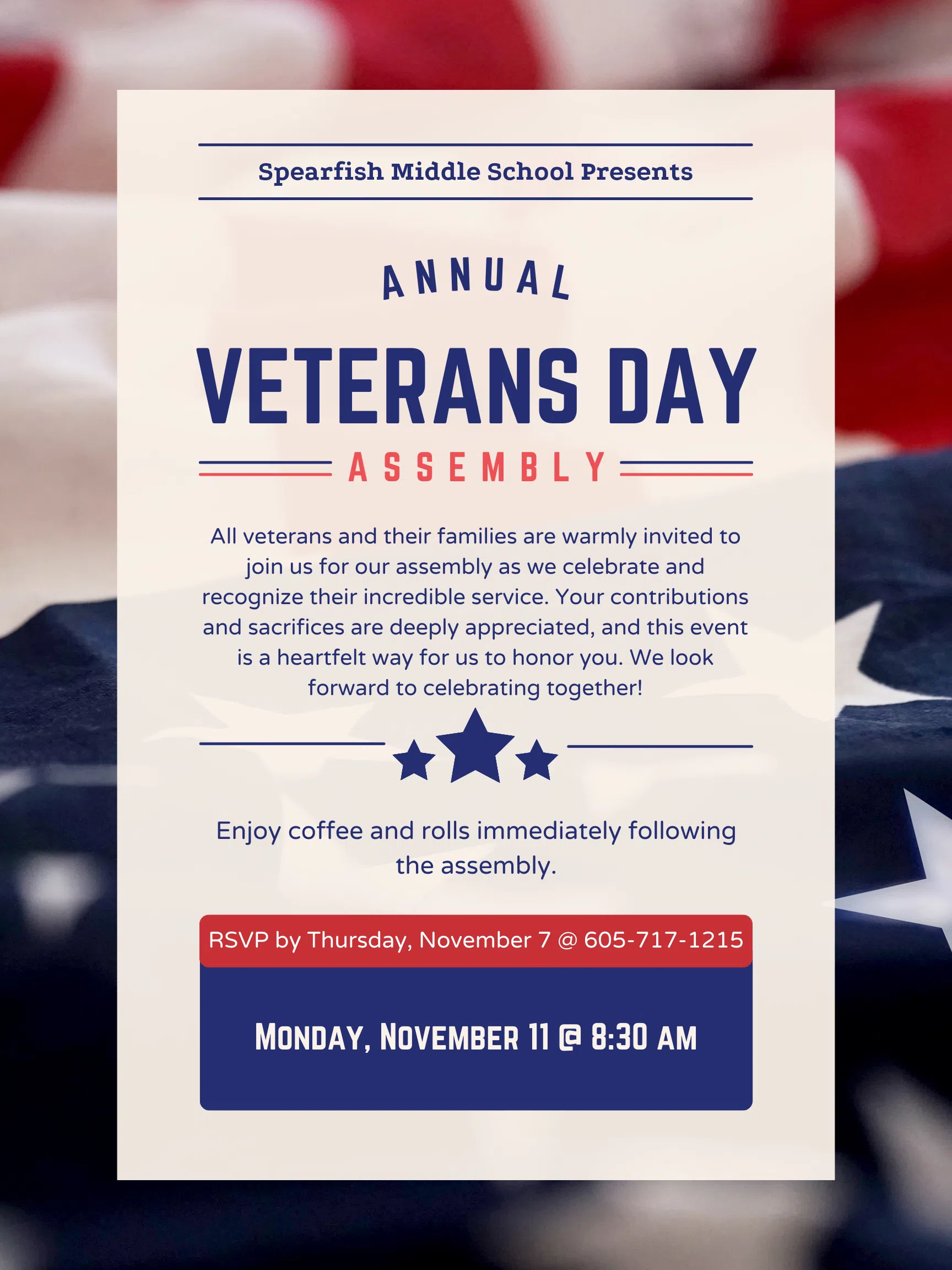 The Spearfish Middle School Student Council wants to invite all veterans and their families to their assembly on Monday, November 11 at 8:30 am as they celebrate and recognize their incredible service. This event is a way to honor veterans. Please call 605-717-1215 to let us know you are coming. Immediately following the assembly, the Spearfish Middle School Student Council invites you to stay for a caramel roll and coffee.