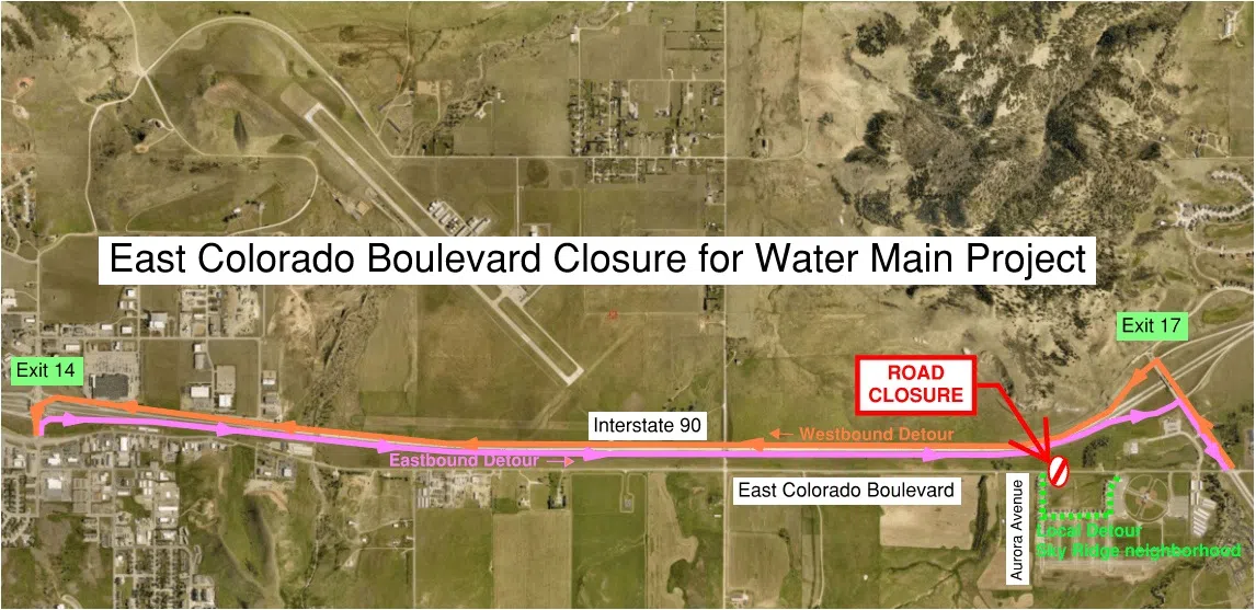 During this closure, through traffic on East Colorado Boulevard will be detoured to Interstate 90 between Exits 14 and 17. Any traffic needing to access locations between Exit 14 and Exit 17 should use Exit 14 until work is complete. Local traffic may detour through the Sky Ridge neighborhood. See the attached map showing the detour routes.